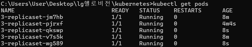 =>replicaset 잘만들어졌는지 확인:kubectl get pods