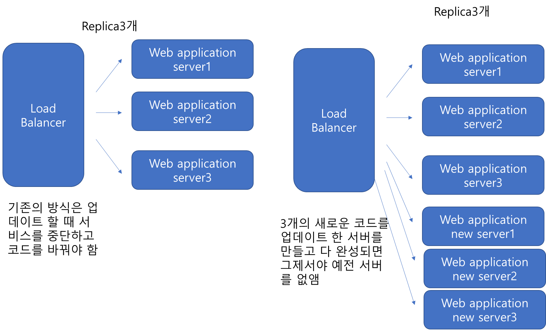 Rolling update:업데이트를 할 때 기존 버전을 일단 그대로 두고 업데이트되는 새로운 pod 을 추가하고 이 파드가 정상적으로 동작하면 기존 버전의 Pod 를 하나 제거하고 또 새로운 버전의 Pod 를 추가해나가는 방식