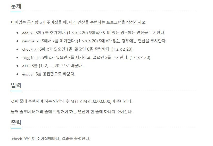 첫째 줄에 수행해야 하는 연산의 수 M (1 ≤ M ≤ 3,000,000)이 주어진다. 둘째 줄부터 M개의 줄에 수행해야 하는 연산이 한 줄에 하나씩 주어진다.