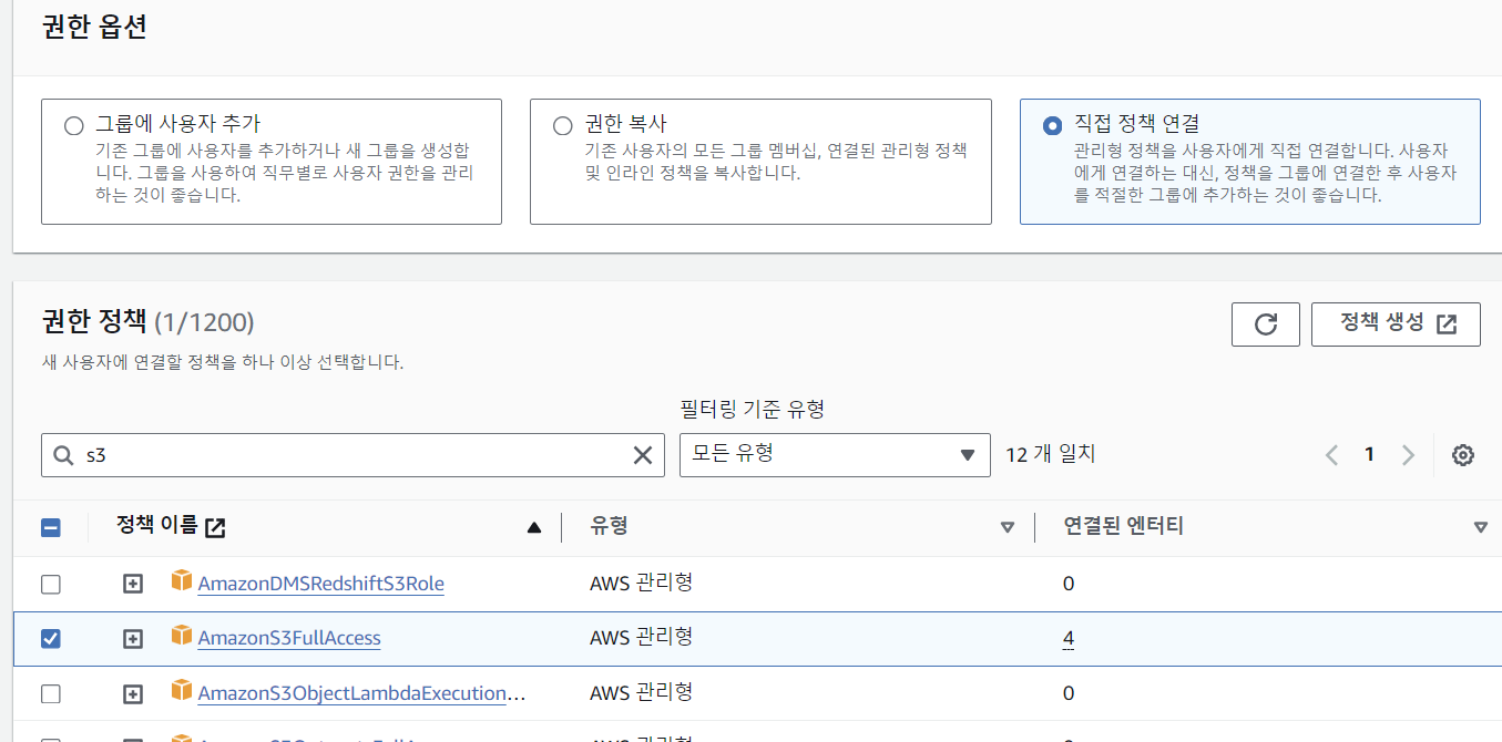 -버킷에 파일을 업로드 할 수 있는 유저 정보 필요: IAM 서비스에서 S3FULLACCESS 권한을 갖는 유저를 생성하고 키를 발급받습니다.