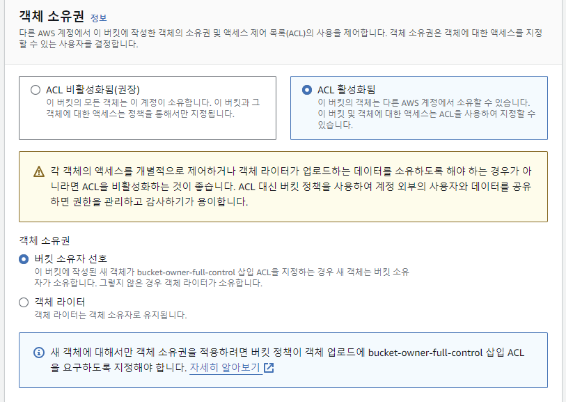 - 버킷을 준비: 외부에서 업로드 가능(버킷을 만들고 정책을 수정)하도록 설정