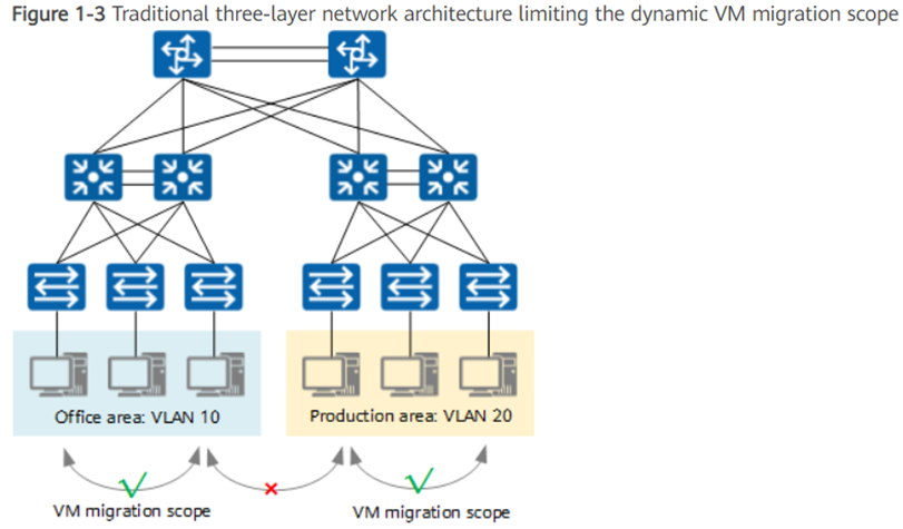 위의 그림에서 전통적인 3-Tier 구조에서 VM들은 필요에 따라 이동할 수 있지만 제약사항이 존재하여 동일한 Layer2 Domain 범위 이내로 이동이 제한됩니다. 또한 서버 가상화로 인해 VM들의 독립성을 유지하기 위해 각각의 VM 마다 VLAN 할당이 필요하고, VM 수량이 증가함에 따라 MAC 주소의 수량이 급증하였습니다. 일반적인 스위치에서 수용할 수 있는 VLAN과 MAC 주소의 용량만으로는 가상화 환경을 지원할 수 없습니다.