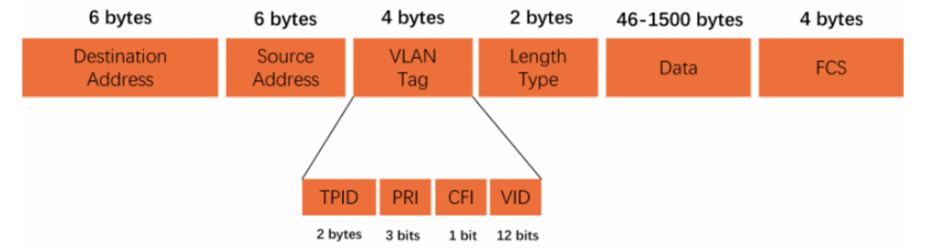 위는 일반 이더넷 데이터 프레임이고 아래는 VLAN데이터 프레임입니다. 스위치는 VLAN 태그에 포함된 정보에 따라 서로 다른 VLAN의 패킷을 식별합니다.