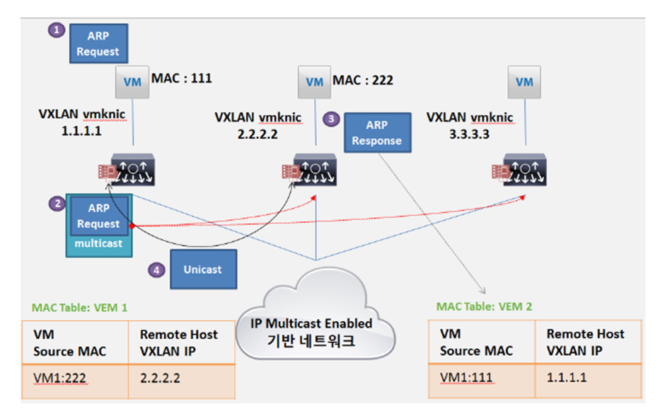 2. ARP Request 는 vSwitch의 MAC 테이블에도 정보가 없어 VTEP Multicast Bust 를 통해 ARP Request 를 전송
