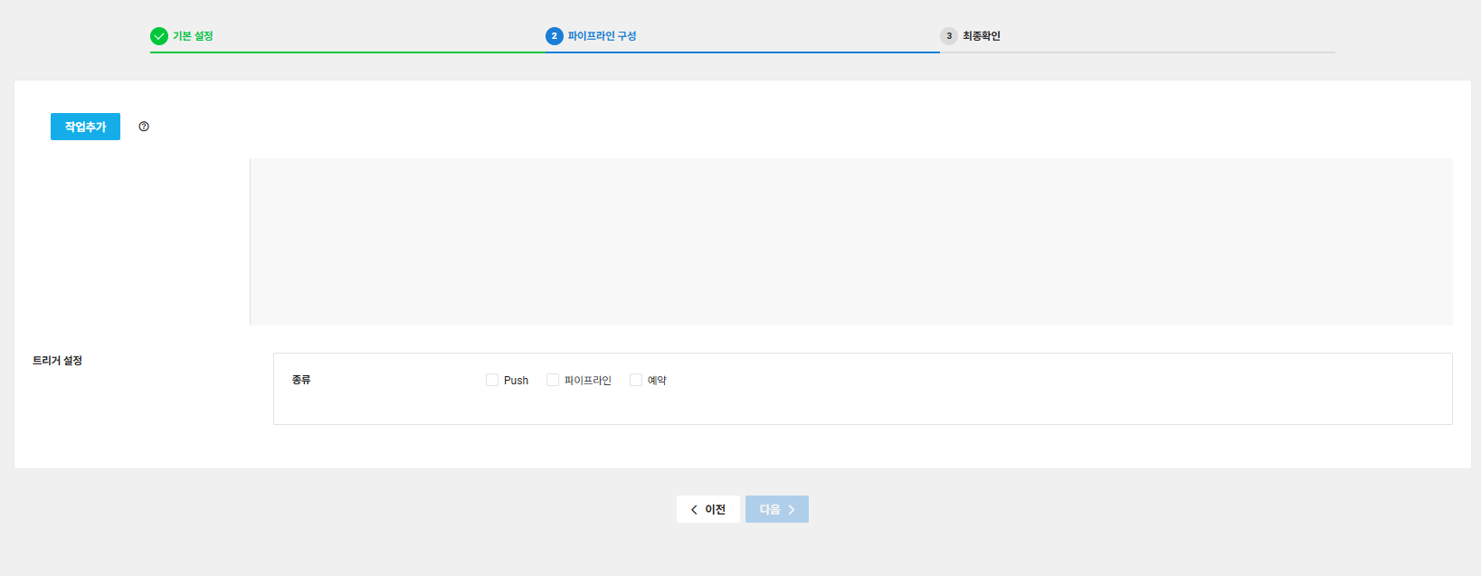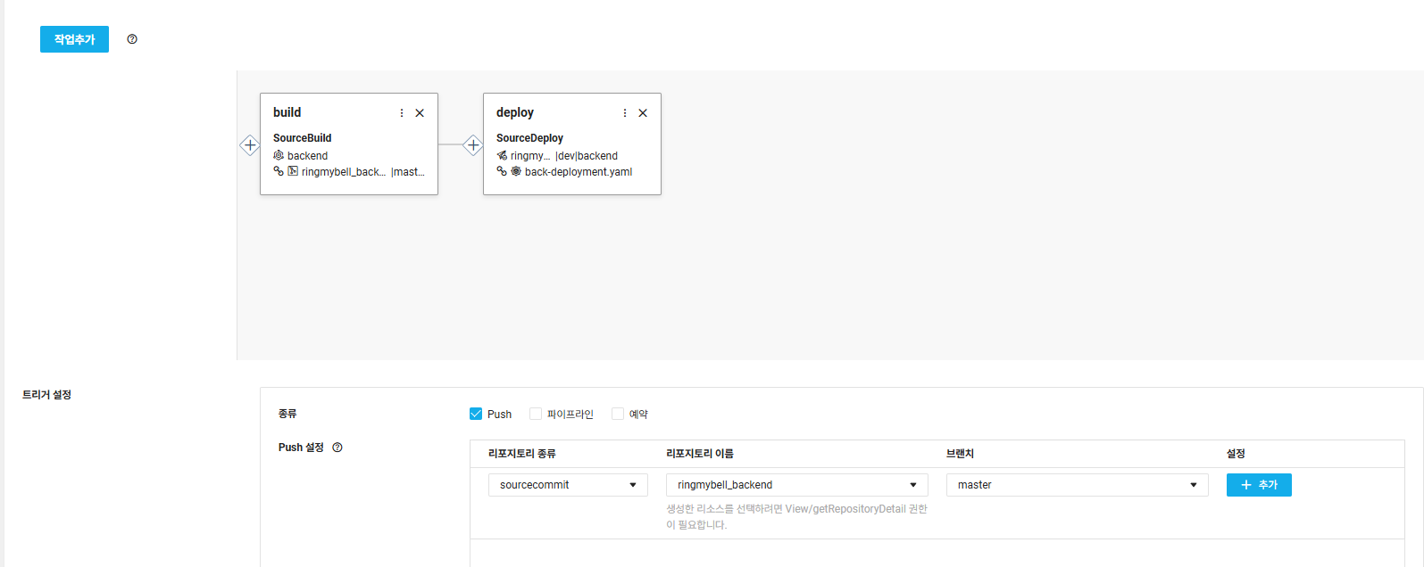 - 하시면 왼쪽에 + 버튼 을 통해 선행작업을 정리하고 트리거 설정에 push 를 설정해놓으시면 Push 하실때마다 자동적으로 실행되는 pipeline 이 구축됩니다.