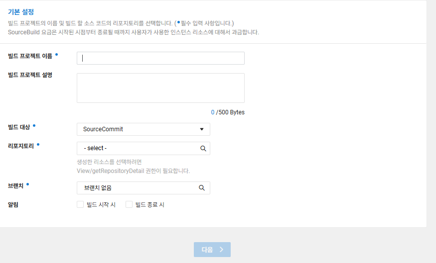 - 기본설정 입력 => 여기서 중요한건 [빌드 대상]에서 Source Commit 에 배포한 리포지토리와 브랜치를 알고 있어야합니다.
