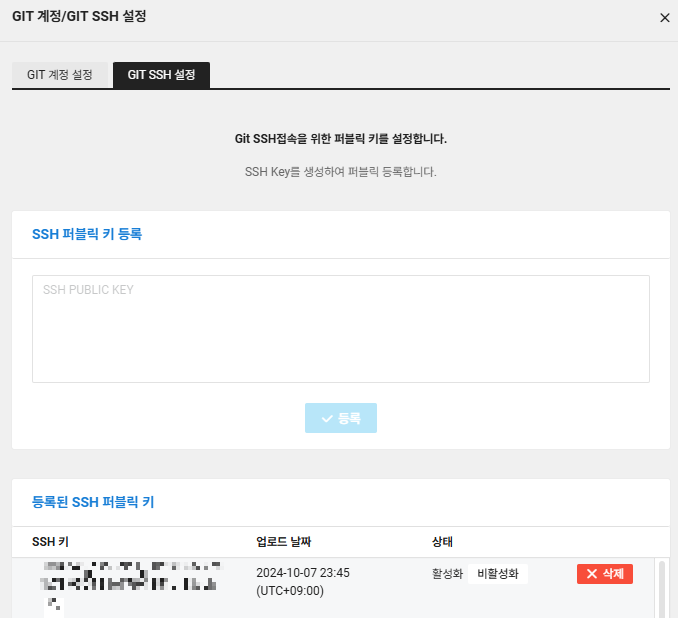 을 입력하면 아래 key값이 나오는데 이를 복사해서 위에 나오는 SSH-퍼블릭 키를 등록하고 나면 SSH 키 값이 생성됩니다.