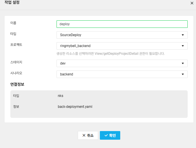 - 위에서 만든Build 와 Deploy 를 활용해 작업설정을해주시고 [확인]버튼을 클릭