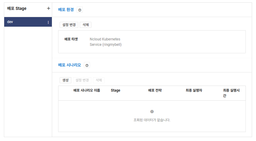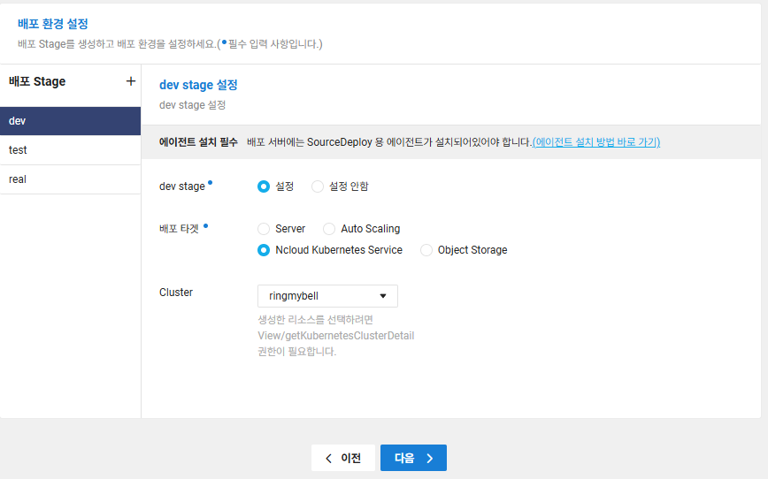 - [배포 stage]에 사용하시는 stage 를 확인하고 stage 에 [설정] 하고 배포 타겟은[ Ncloud Kubernetes Service] 와 생성된 Cluster 를 클릭하시고 [다음] 누르시면 생성됩니다.