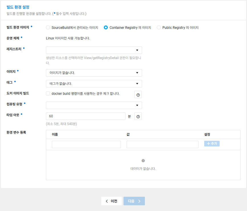 - [Container Registry의 이미지] 로 변경하고 미리 생성해둔 Container Registry 에 레지스트리를 클릭하고 이미지이름과 태그를 선택하고 [도커 이미지 빌드] 하는 부분에 체크를 하고 그 이후 컴퓨팅 유형은 자유롭게 해주시고 환경변수 등록 하실꺼 있으면 등록하시고 넘어갑니다.