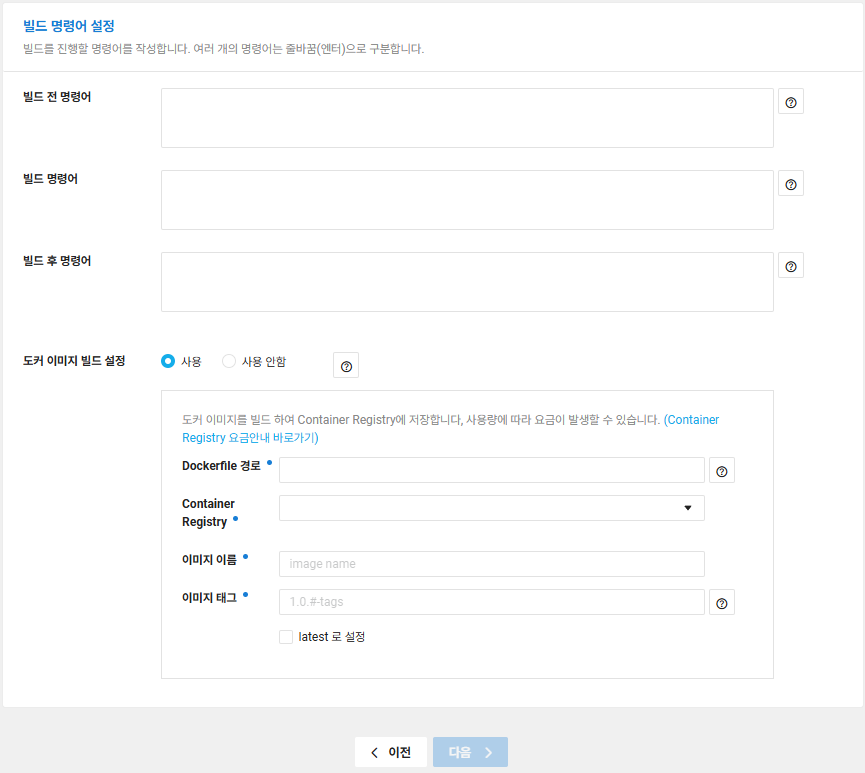 -빌드 전 명령어 및 빌드 명령어 빌드후 명령어가 필요하시면 설정해놓고 [도커 이미지 빌드 설정]에 사용을 하면 Dockerfile 경로를 선택할 수 있습니다. 설정한 후 Container Registry와 이미지 이름/태그를 설정하고 [다음]을 누르시면 설정은 완료됩니다.