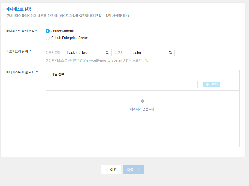 - 기본설정하시고 [다음] 버튼을 클릭하시면 아래와 같은 창이 뜨는데 SourceCommit 에 코드를 배포 하셨으면 여기에 있는 리포지토리를 설정하시고 파일경로는 [yaml파일이름].yaml을 작성해주시고 [추가버튼]을 누르고 넘어가면 됩니다