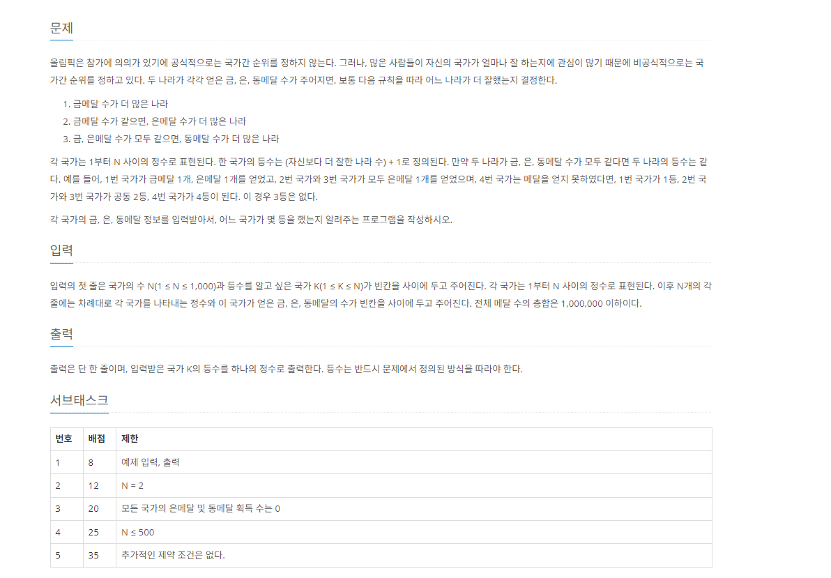입력의 첫 줄은 국가의 수 N(1 ≤ N ≤ 1,000)과 등수를 알고 싶은 국가 K(1 ≤ K ≤ N)가 빈칸을 사이에 두고 주어진다. 각 국가는 1부터 N 사이의 정수로 표현된다. 이후 N개의 각 줄에는 차례대로 각