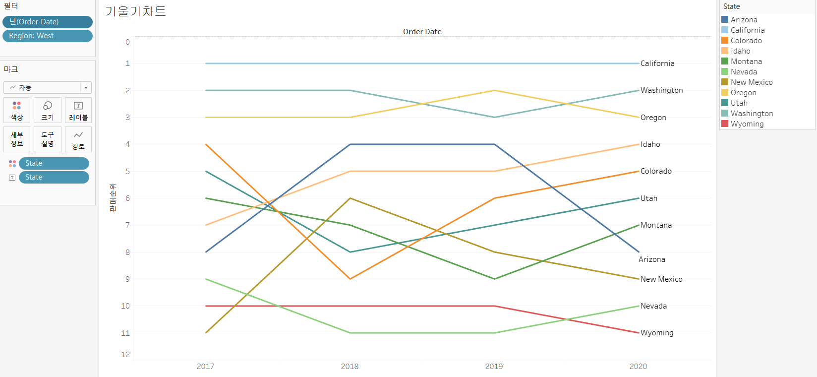 =>2개의 기간보다 많은 기간을 가지고 그리면 범프 차트라고 합니다.(위의 경우에서 년도별 필터만 제거)