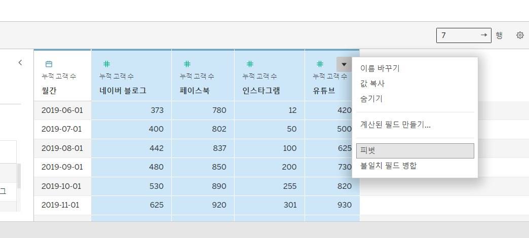 열을 행으로 치환(Pivot):전환된 열을 선택하고 우상단의 삼각형을 눌러서 피벗 선택