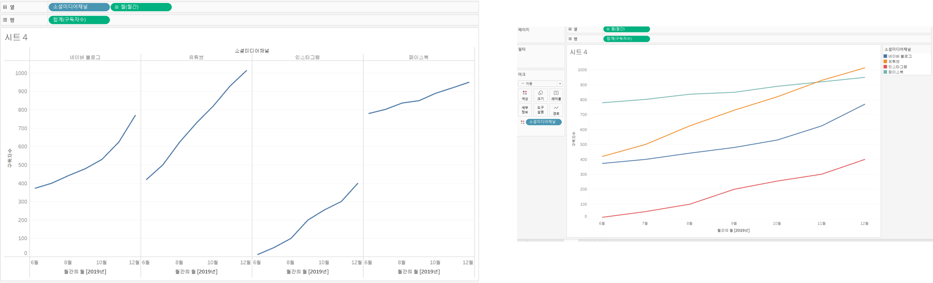 -[소셜 미디어 채널] 필드를 색상 카드에 배치해서 4개의 분류가 하나의 뷰에 그려지도록 설정