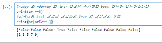 =>인덱싱을 할 때 bool 배열을 대입하면 True인 데이터만 추출됩니다.