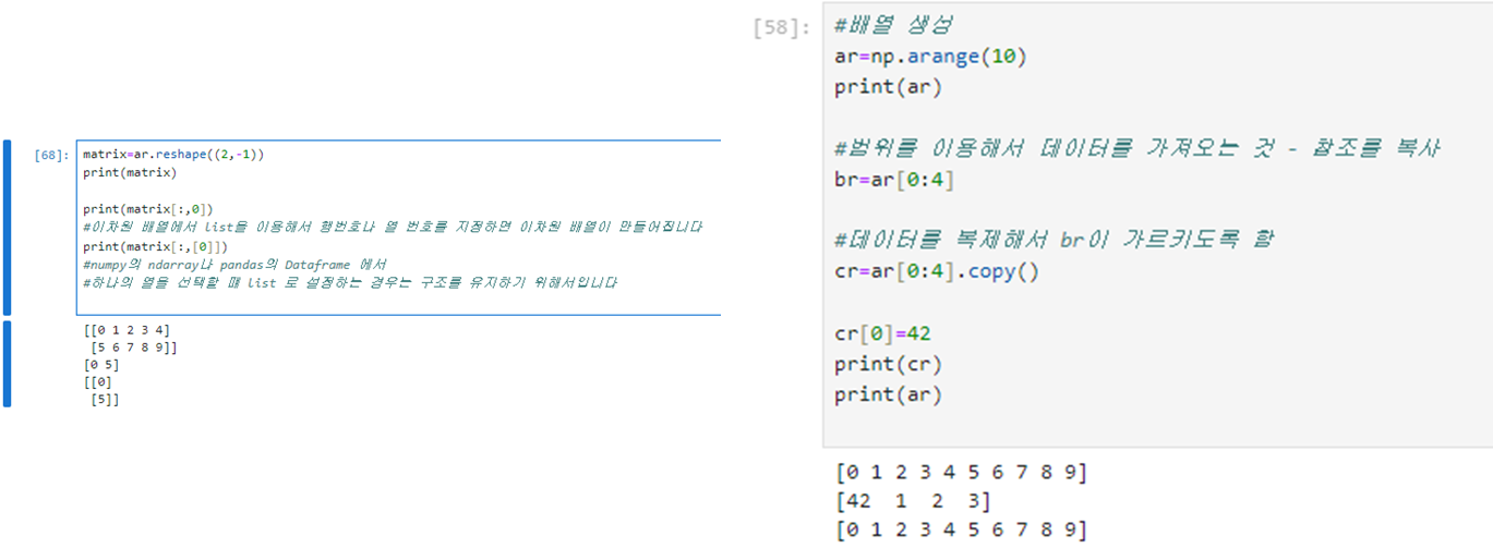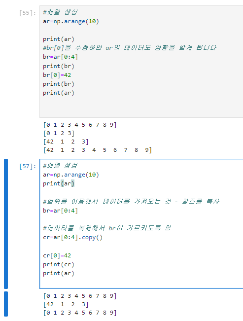 3)인덱싱이나 슬라이싱은 원본 데이터의 참조만 가져오는 것