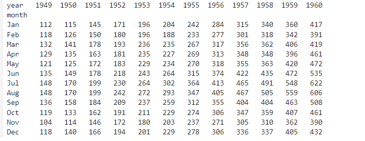 data=flights.pivot(index="month",columns="year",values="passengers")