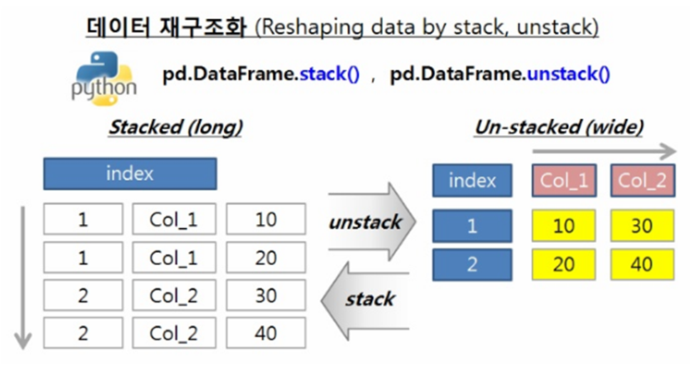 stacked: 가로방향으로 넓게 펼쳐진 데이터를 세로 방향으로 길게 만드는 작업 -컬럼을 인덱스로 활용
