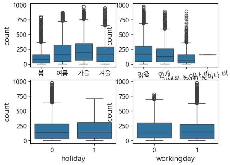 =>계절, 날씨, 공휴일 여부, 근무일 별 대여 수량을 시각화