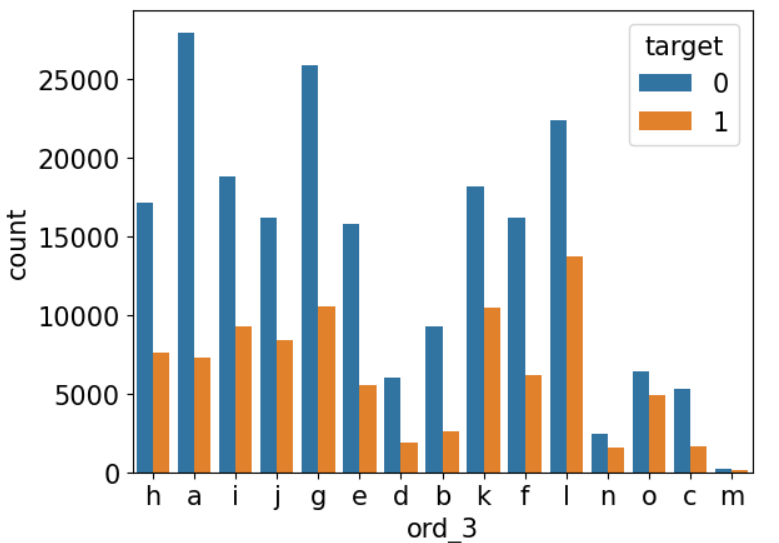 =>순서형 피처(ord_)와 타겟의 분포 확인