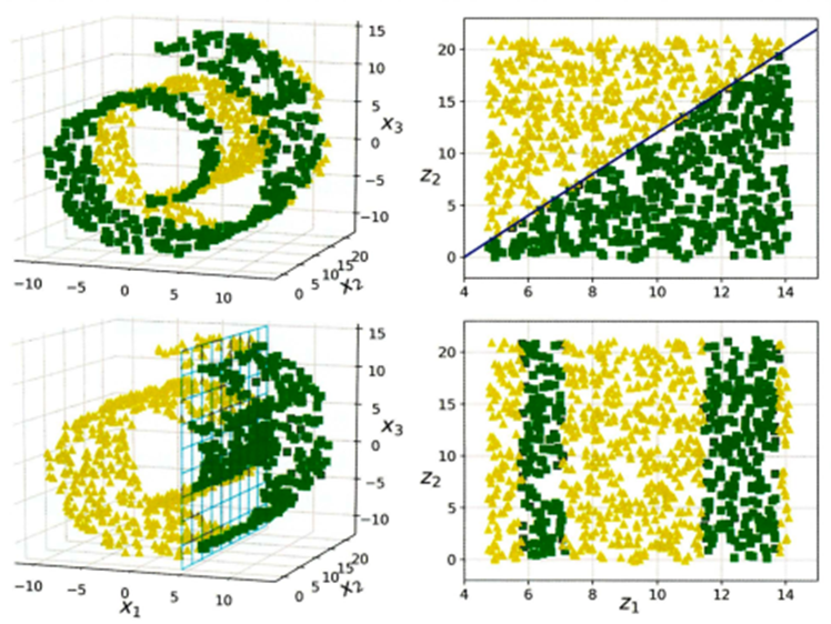 위 그림은 LLE , 아래그림은 일반적인 PCA 만 진행했을 텐데 , LLE 같은 경우에는 X축으로 분류가 보임. PCA 도 분류할 수는 있지만 복잡한 식을 계산해야됨.