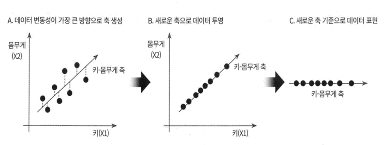 =>여러 변수 간에 존재하는 상관관계를 이용해서 이를 대표하는 주성분을 추출해서 차원을 축소하는 기법