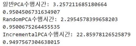 =>차원을 축소하며 일부 정보가 유실되기 떄문에 훈련속도가 빨라지기는 하지만 성능은 나빠질 가능성이 높습니다.