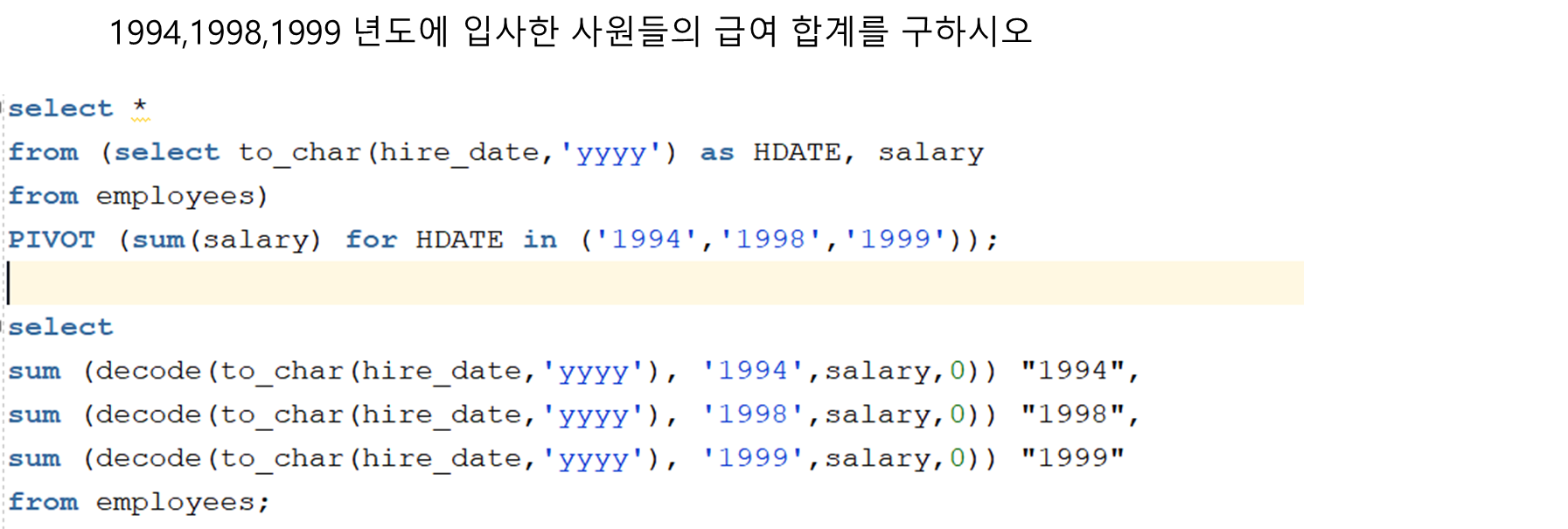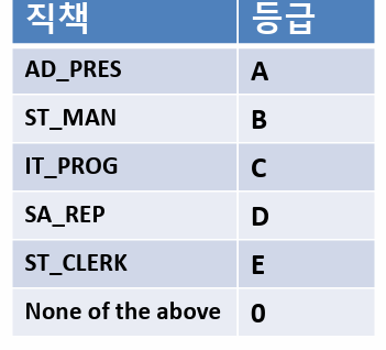 Exam5) 다음데이터를사용하여DECODE/CASE 함수를통해JOB_ID 열의값을기반으로모든사원 의등급을출력하시오