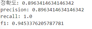 결과는 위와 같이 나오는데 , recall 값이 1이 나오는게 의심됨.이런 경우 confusion matrix로 확인한번 해보는게 좋음