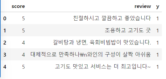 score 은 별점이고 y 가 감성인데 score 가 4이상이면 1 그렇지 않으면 0으로 라벨링