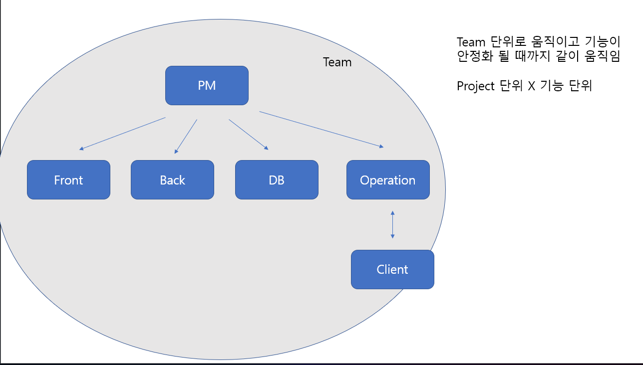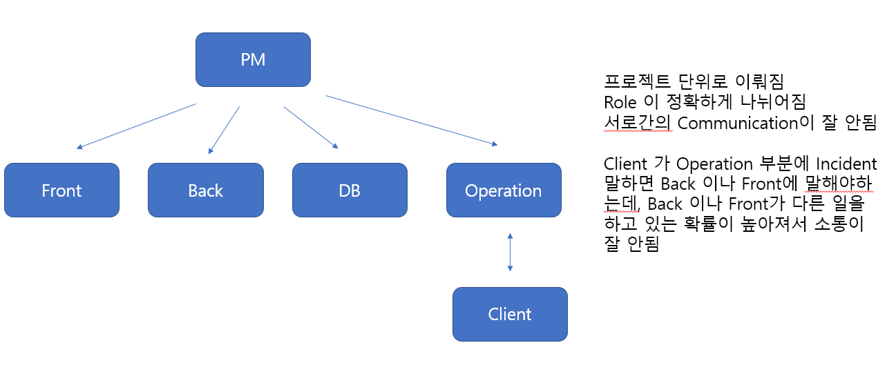 -다양한 역할(기획자, 디자이너,UI 개발자, 서버 개발자, 설계자 등)으로 구성되고 이 팀은 서비스를 처음부터 끝까지 만들기 위한 모든 단계의 역할을 모두 갖추고 있는 구조