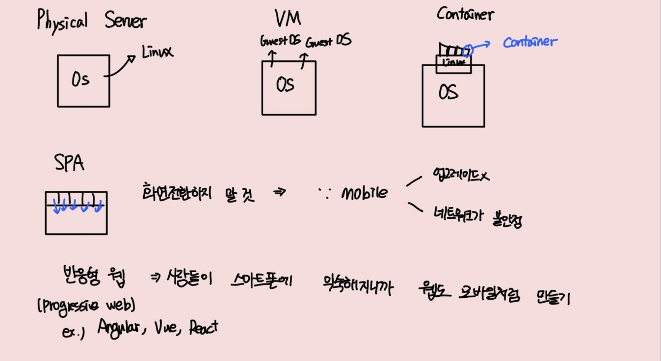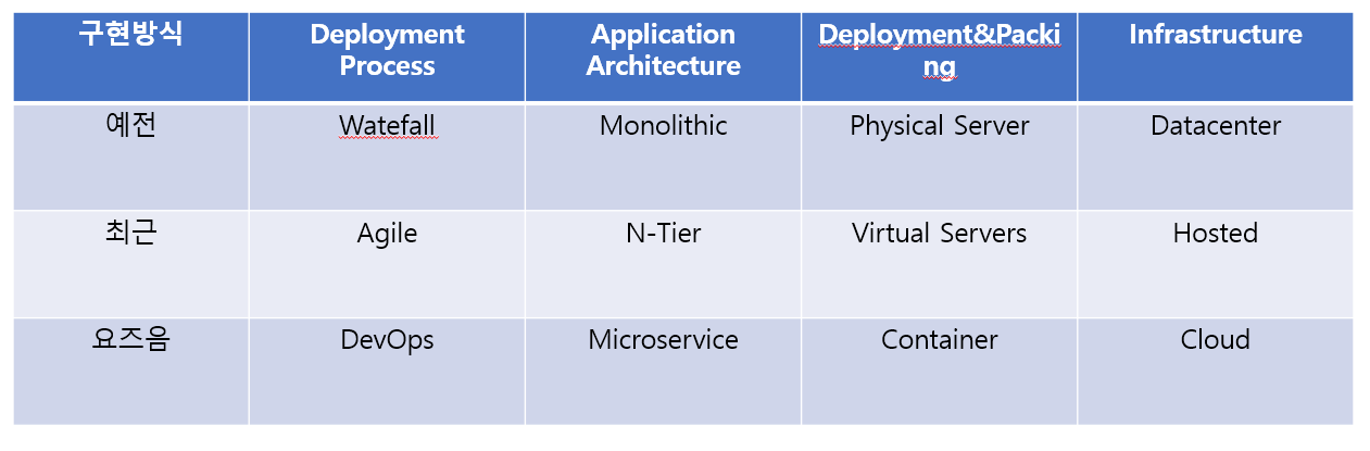 =>Publoc Cloud 나 베어 메탈, private cloud, Virtual Machine, Container(Docker) ,컨테이너 오케스트레이션(Kubenetes)